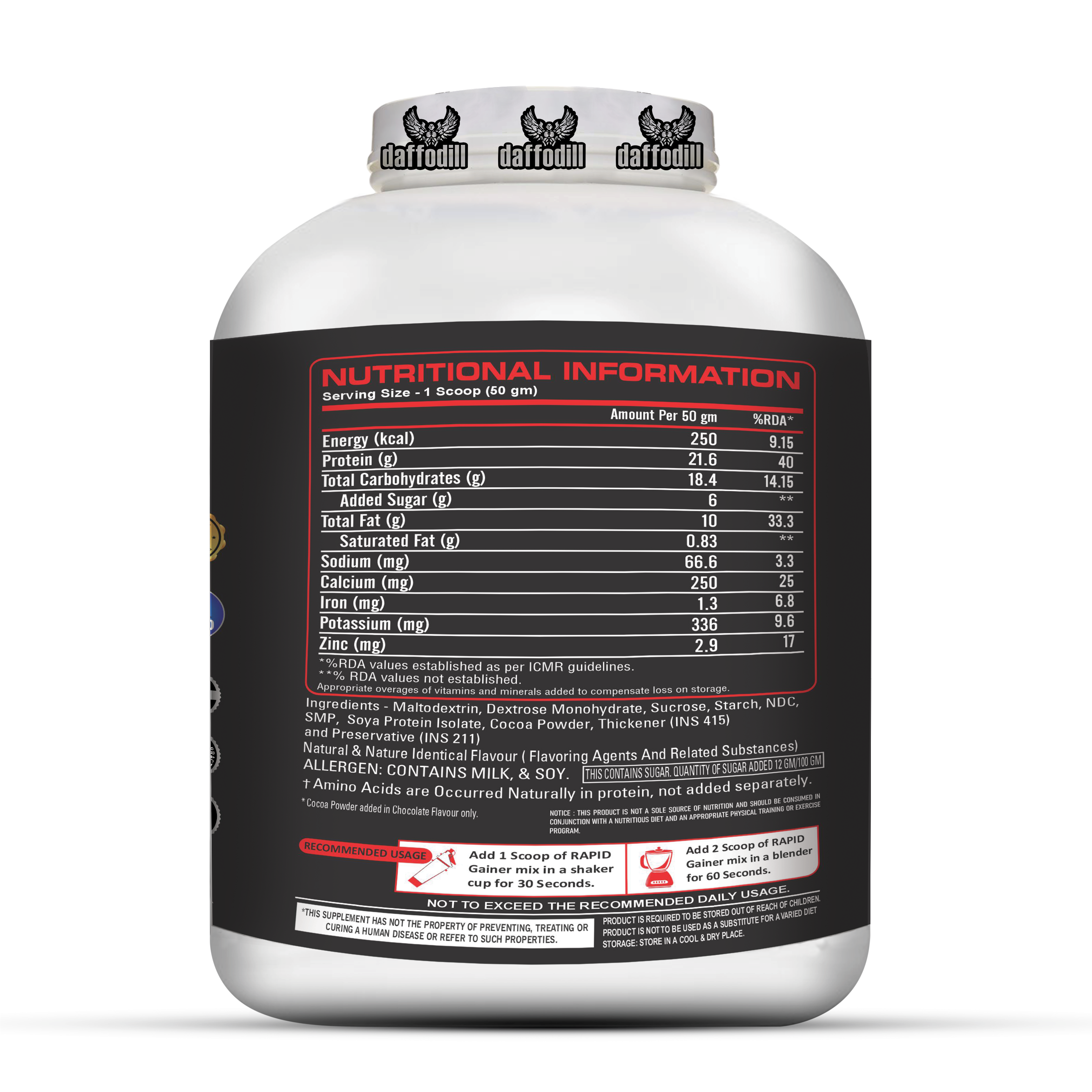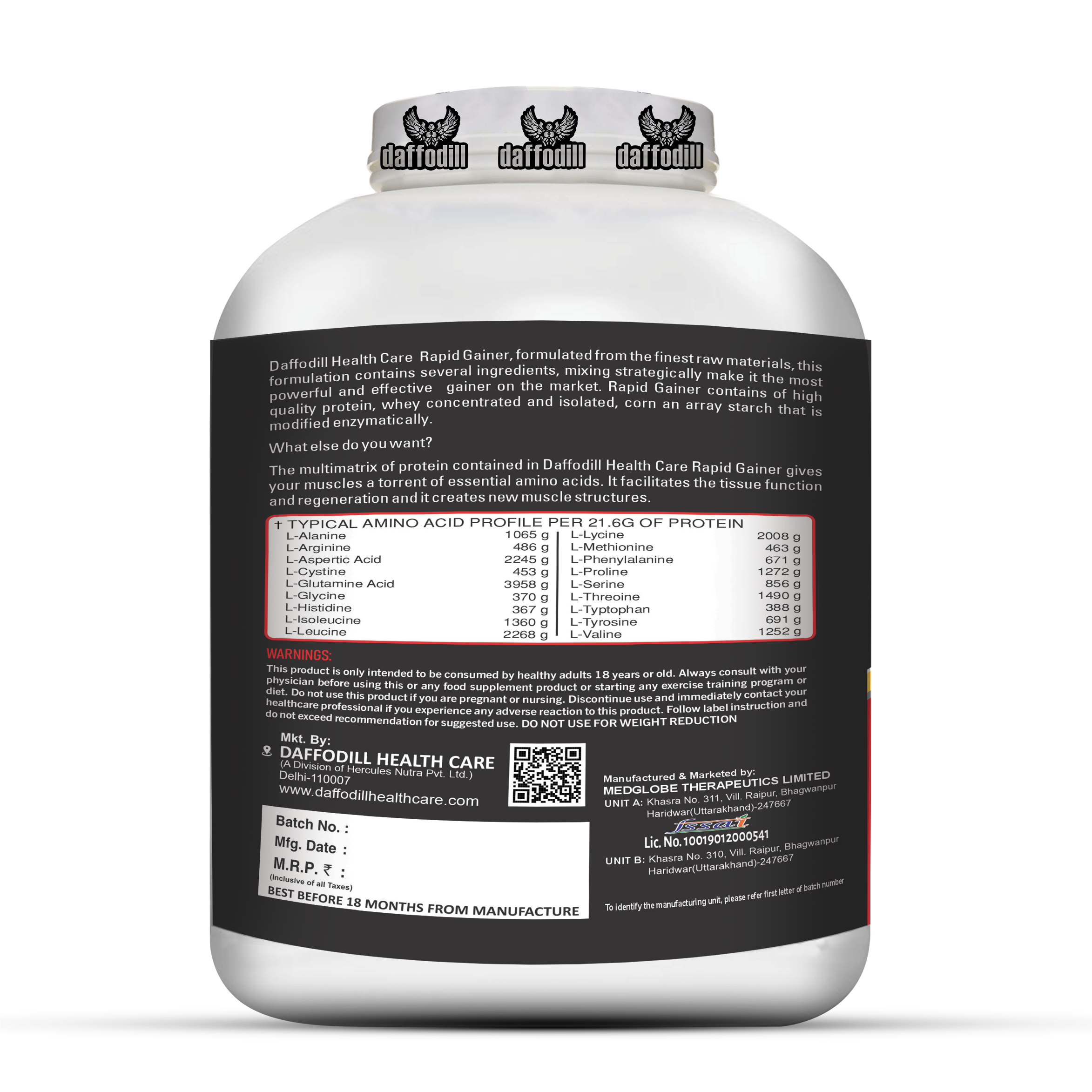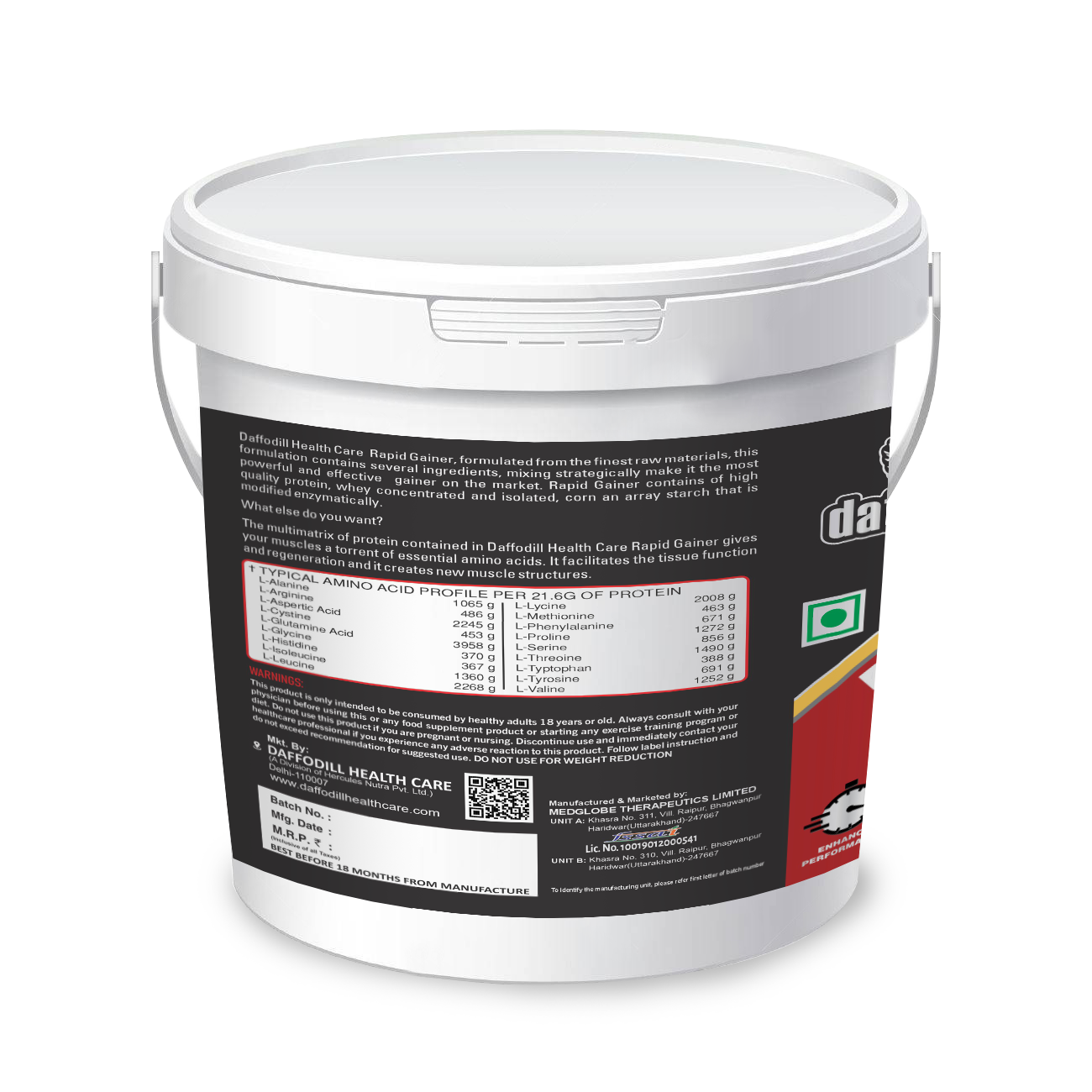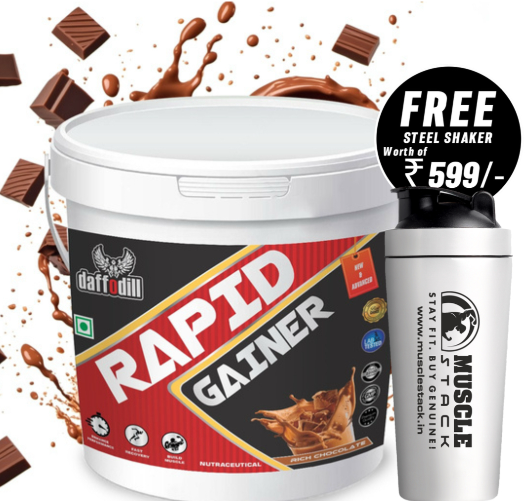 Daffodil Rapid Gainer is a weight gainer powder that is designed to help people gain muscle mass and strength. It is made with a blend of protein, carbohydrates, and calories, which can help to support muscle growth and recovery.