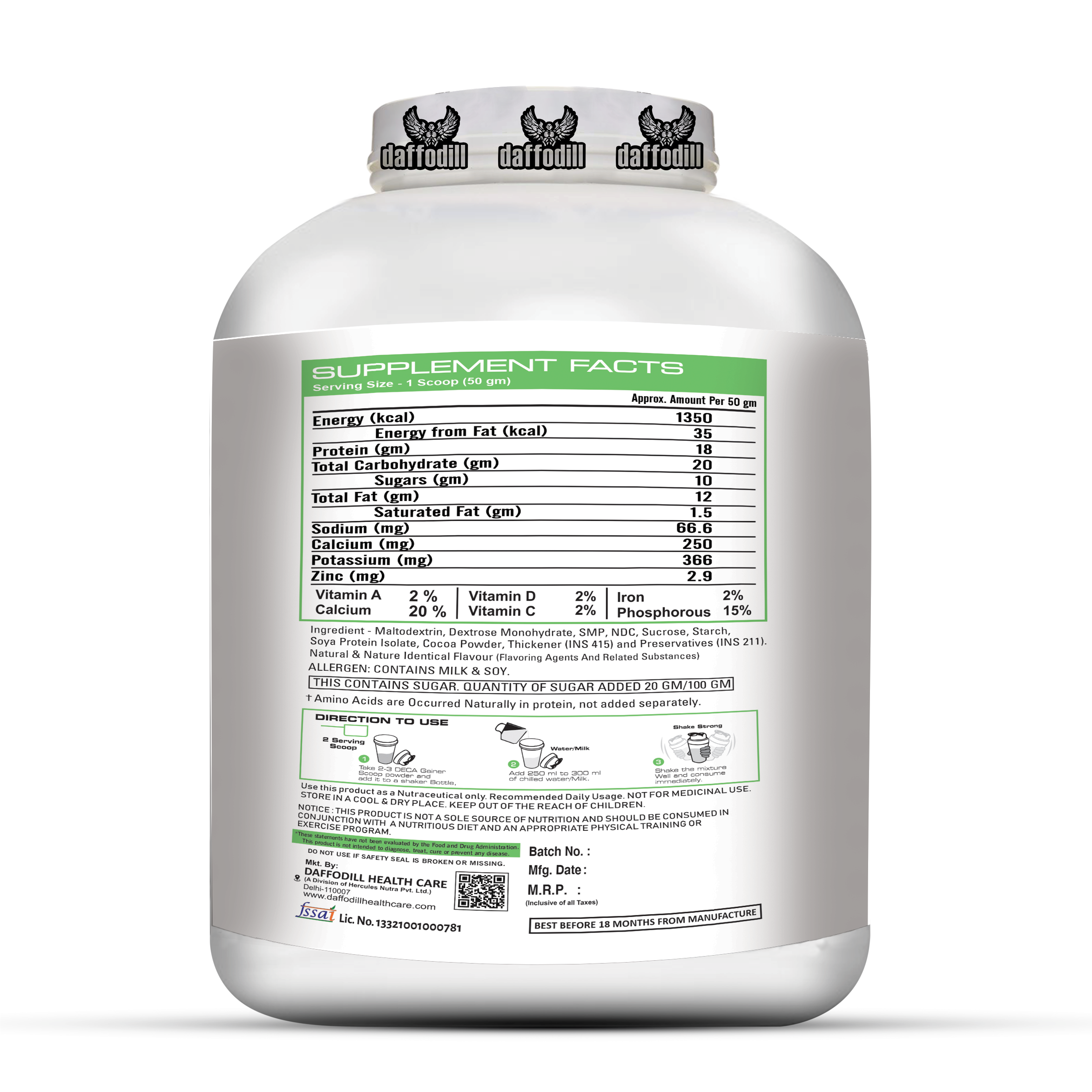Daffodill Gainer is a high-calorie, high-protein weight gainer formula that is designed to help you achieve your muscle building and weight gain goals. It is packed with 520 calories, 50 grams of protein, and 20 grams of carbohydrates per serving, making it the ideal post-workout and between meals shake for sizing up your goals.