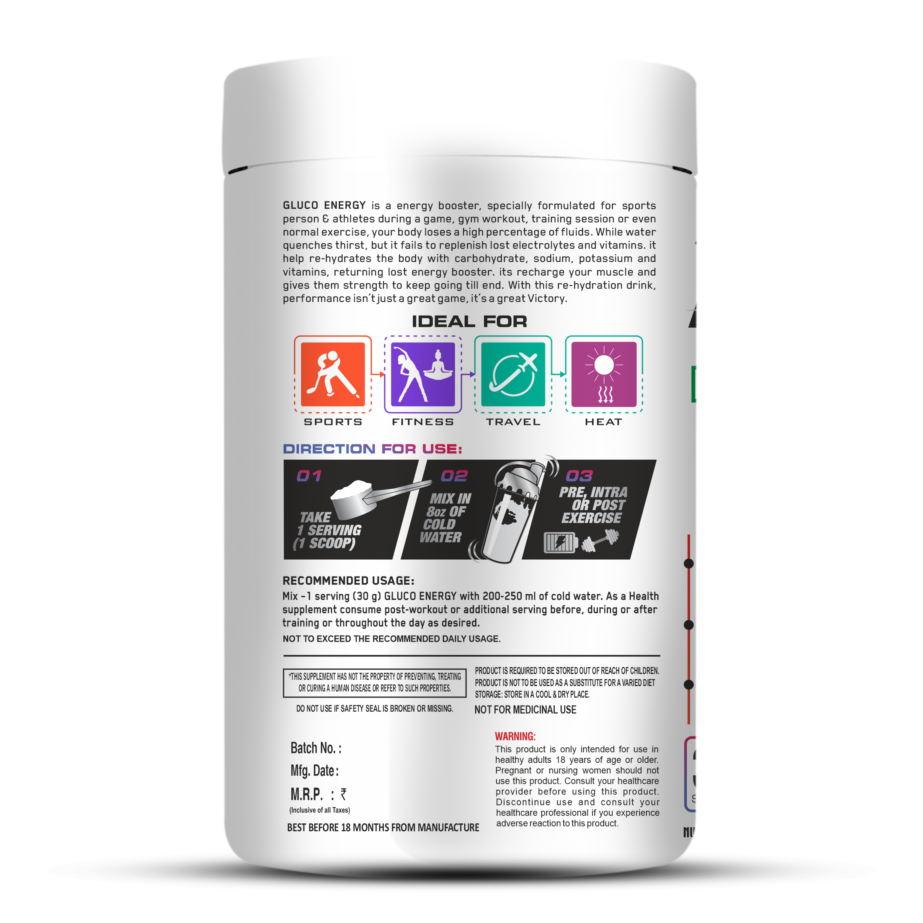 Gluco Energy the ideal pre-workout drink for fitness enthusiasts, sports persons, and travelers. Specially formulated by Eligator Nutrition, this high-performance pre-workout powder is designed to provide instant energy and enhance your workout performance. Pre-Workout Energy Boost: Gluco Energy is the perfect companion for your fitness routine, delivering a powerful surge of energy to fuel your workouts and help you achieve your goals. Instant Energy and Focus: With its unique blend of ingredients, including energy-boosting compounds, Gluco Energy enhances focus and concentration, allowing you to stay in the zone during intense training sessions. Endurance and Stamina: Push your limits and go the extra mile with gluco Energy's endurance-enhancing formula, which helps combat fatigue and improve overall stamina.
