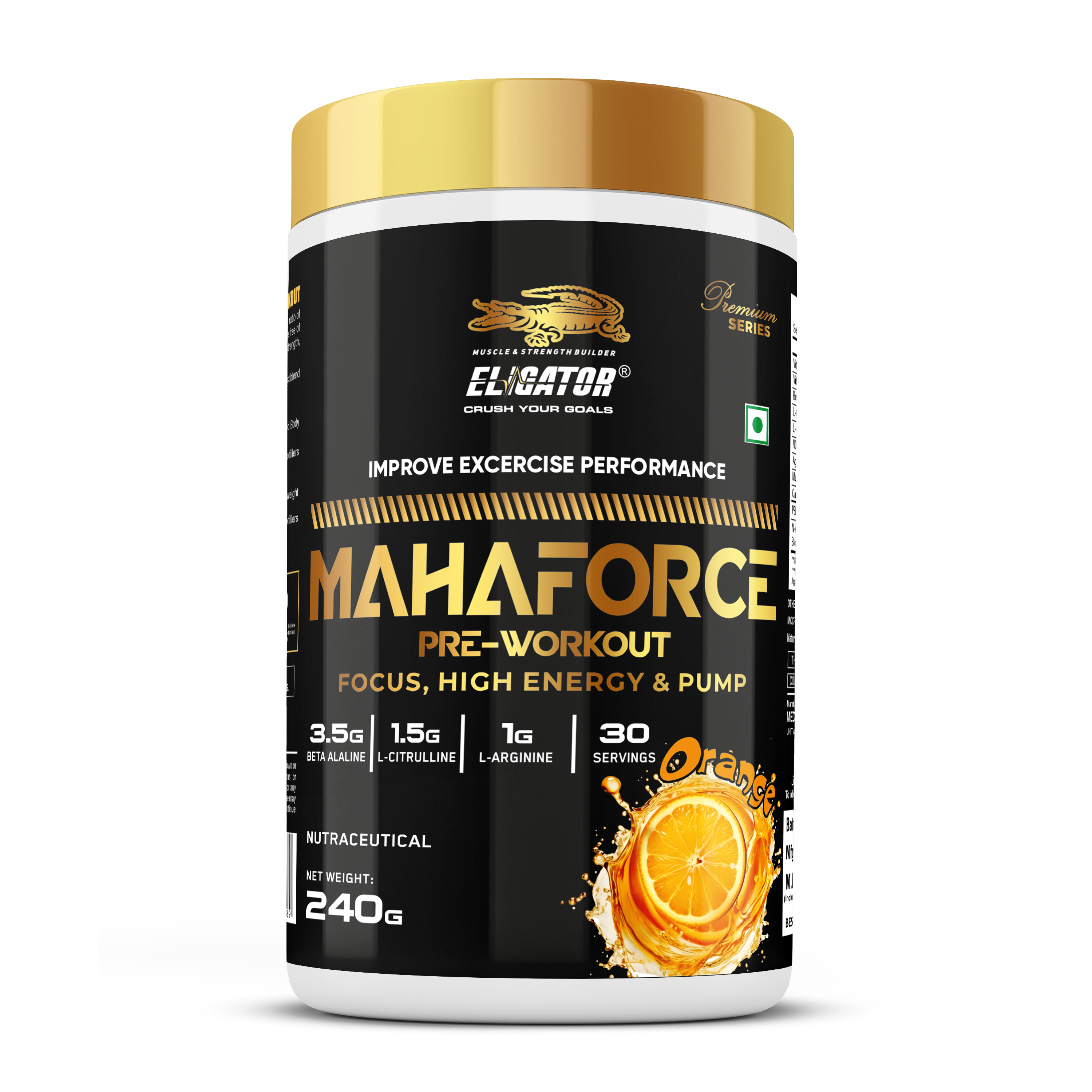 With Eligator Nutrition Premium Series Mahaforce Pre Workout, fuel your body with the strength and focus it needs to achieve peak performance in every workout. Simply mix one scoop with water and feel the difference!