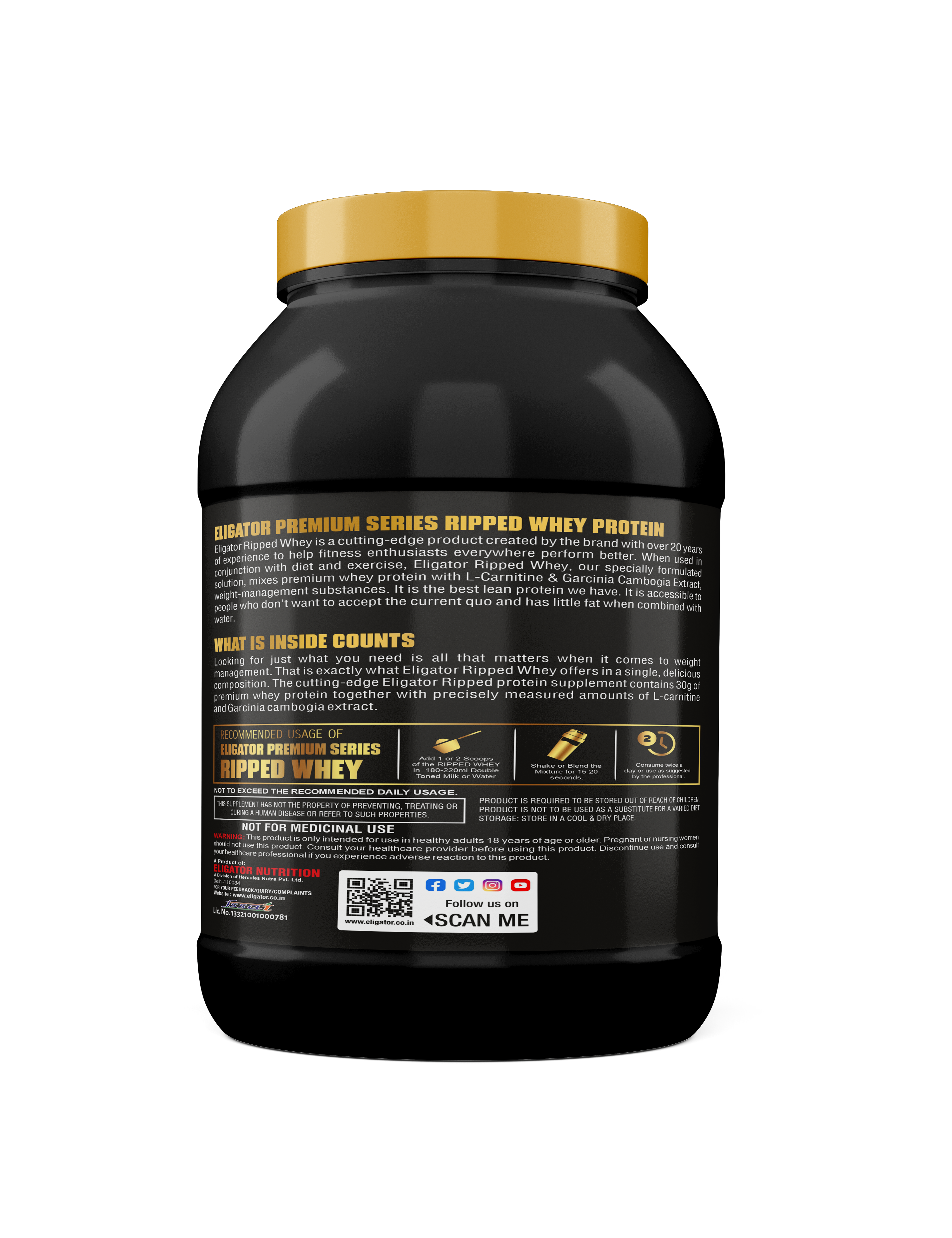 Eligator Nutrition Premium Series Ripped Whey 2 Kg is designed for those looking to achieve lean muscle mass while keeping body fat in check. With 30g of protein per serving, this high-quality whey protein helps support muscle growth, recovery, and performance without the added fat and carbohydrates that can slow down your progress. Each container provides 55 servings, making it a perfect choice for long-term fitness enthusiasts.
