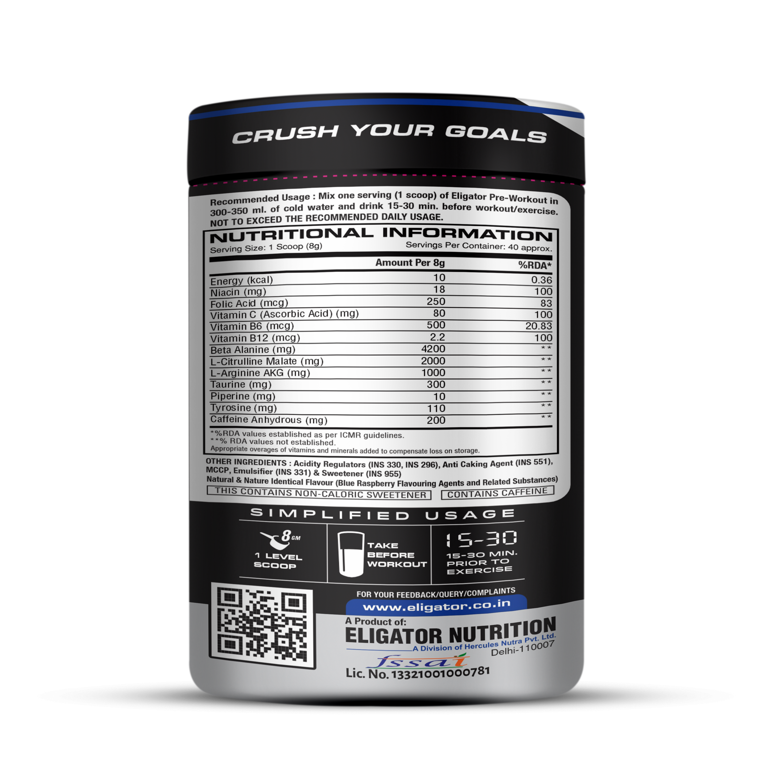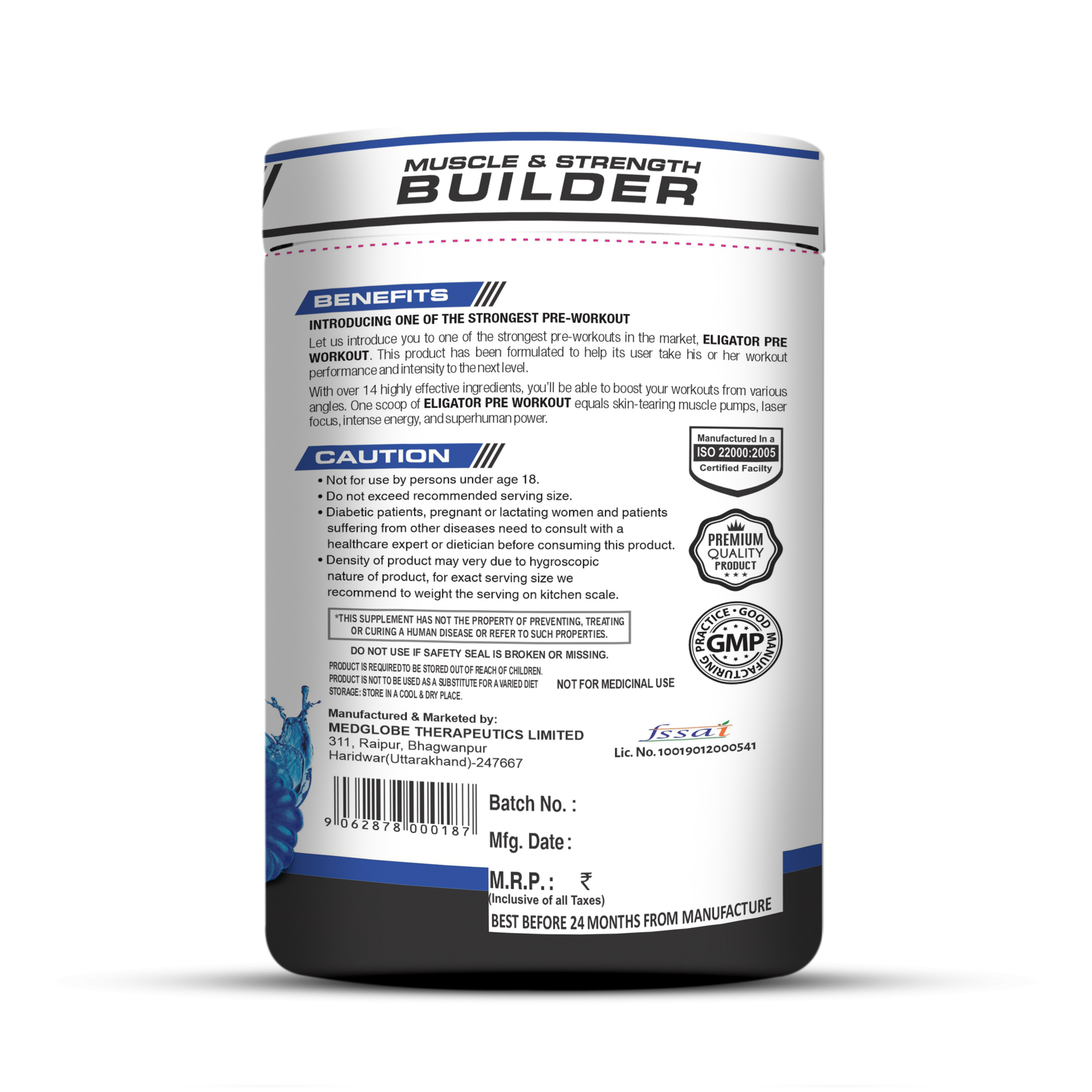 Eligator Pre-Workout is a powerful pre-workout supplement that is designed to help you push your workouts to the next level. It is formulated with a blend of scientifically-backed ingredients that can help you achieve your fitness goals, including: