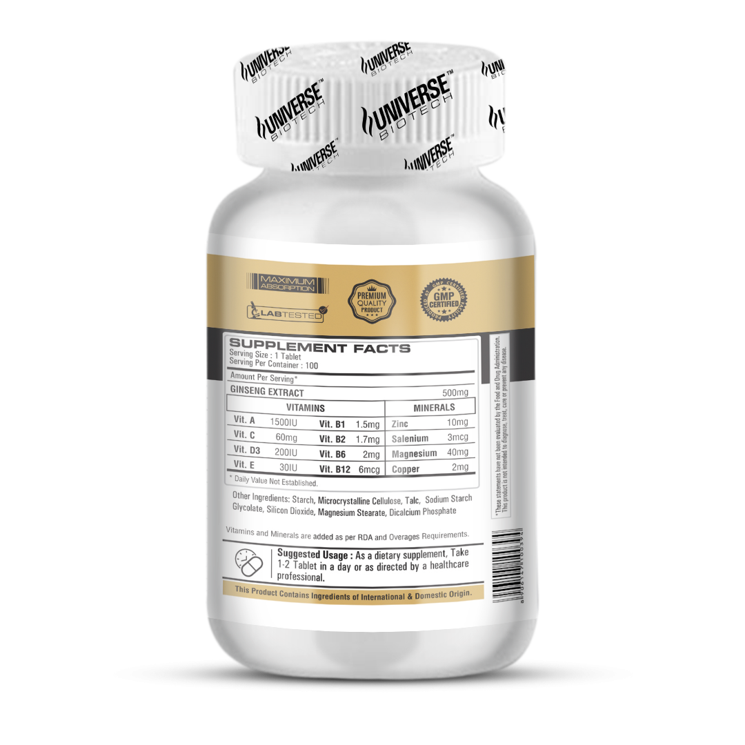Universe Biotech Panax Ginseng Gold 500 Mg 100 Tablets is a premium supplement designed to naturally enhance stamina, performance, and overall vitality. Panax Ginseng, a powerful adaptogen, is known for its ability to improve energy levels, reduce fatigue, and support both physical and mental performance. Each tablet contains 500 mg of high-quality Panax Ginseng, making it the perfect choice for those looking to boost their endurance and tackle daily challenges with more vigor.